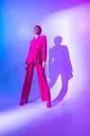 Model in vibrant fuchsia power suit lit with bold magenta and blue gel lighting
